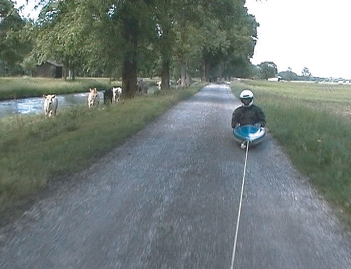 Les installations et vidéos de Roman Signer sont toutes basées sur l'idée de l'accident, du risque, de la catastrophe toujours possible. Il nous montre des situations ridicules, stupides, répétitives, où on frôle la chute, et, si on y succombe, l'image suivante régénère tout, phénix renaissant.